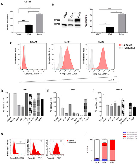 Evaluation of multiple stemness markers in parental medulloblastoma (MB) cells. Gene (A) and protein expression of CD133 by Western blot (B); band intensities were normalized against HSP70, and DAOY expression level was taken as 1) and flow cytometry analysis. Whole western blots related to main Figure 1B are shown in Fig. S5. (C). Stem flow cytometry analysis of DAOY (D), D341 (E) and D283 (F) cells grown in normal medium. Flow cytometry analysis of CD15 expression (G) and graphic representation (H). Results are expressed as a mean of three biological replicates ± standard error of the mean (SEM). Differences were tested with Student’s t-test. ** p < 0.001; *** p < 0.0001.