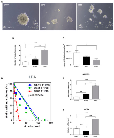 DAOY cells generated an extremely low rate of medullospheres (MS), characterized by large and regular shapes (Figure 2A–C). The number of MS obtained from D341 cells was significantly higher compared with DAOY-MS, but dimensionally we did not observe significant differences (Figure 2A–C). Notably, D283 cells generated the highest number of MS, although they had the smallest size (Figure 2A–C). The statistically significant increase of CD133 at protein level confirms the undifferentiated cell enrichment after MS assay (Figure S3). According to MS generation ability, the limiting dilution assay (LDA) clearly shows a significantly higher frequency of initiating cells (F = 1/13) in D283 than D341 (F = 1/58) and DAOY (F = 1/63) cells (Figure 2D). Finally, to better understand the genetic stemness regulatory network in our cell lines maintained in basal culture conditions, we carried out the analysis of two essential transcription factors (NANOG and OCT4) that regulate self-renewal and pluripotency of stem cells. Our results showed a significant increase in gene expression in D283 cells with respect to other MB cell lines (Figure 2E,F; p < 0.0001), strongly highlighting a cancer stem-like phenotype of D283 cells.