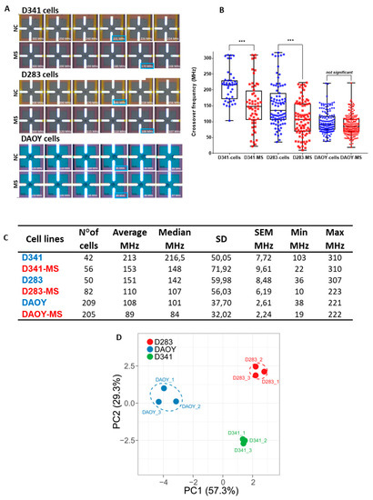 MB cell lines, cultured in normal or MS medium, were also characterized by establishing their HF–DEP crossover frequency, defined as the value able to move cells from a negative to positive DEP state. The imaging sequences (boxed in blue, Figure 3A and Figure S4) represent the cell trapped by repulsive forces in negative DEP, and then, the cell attraction on the electrode surface in positive DEP after applying a gradual frequency decrease. Considering the measured crossover frequencies, D341-MS and D283-MS showed a statistically significant lower crossover frequency than cells cultured in normal conditions (Figure 3B; p = 2 × 10−5). On the contrary, DAOY-MS showed very similar crossover frequencies compared with their parental counterpart. The box plots graphic representation illustrates the median together with the min/max crossover frequency for each cell population (Figure 3B). The complete set of statistics concerning the characterization of MB cells crossover frequencies is summarized in Figure 3C, listing the average, median, standard deviation, standard error, and minimum and maximum crossover frequency values for each cell population. Finally, the integration of the several stem cell properties that we analyzed for MB cells through the Principal Component Analysis (PCA) clearly demonstrated that D283, D341, and DAOY cells were characterized by peculiar phenotypic stem cell features, which reflected well their endowed functional ability to generate MS and/or self-renewal (Figure 3D).