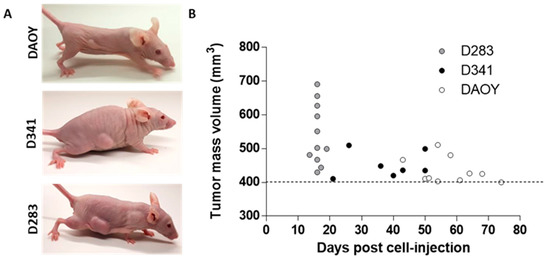 To examine the tumorigenic potential of MB cell lines, 6 × 106 cells of each cell line was injected subcutaneously into nude mice. Although the subcutaneous injection of brain tumor cells could present some limitations compared to their orthotopic implantation, it ensured quick and easy monitoring of tumor engraftment and progression, and it is generally accepted as a proof of concept of cell tumorigenicity. As shown in Figure 4A,B, D283 cells disclosed 100% of tumor engraftment within 16 days post injection. Tumor incidence, 50 days post-implantation, was 100% (7/7) and 30% (3/10) for D341 and DAOY cell lines, respectively; subcutaneous implantation of DAOY cells reached 100% of tumor incidence within 74 days (Figure 4B). The higher tumorigenic potential shown by D283 cells well reflects the in vitro results demonstrating, concordantly, a cancer stem-like phenotype of D283 cells.
