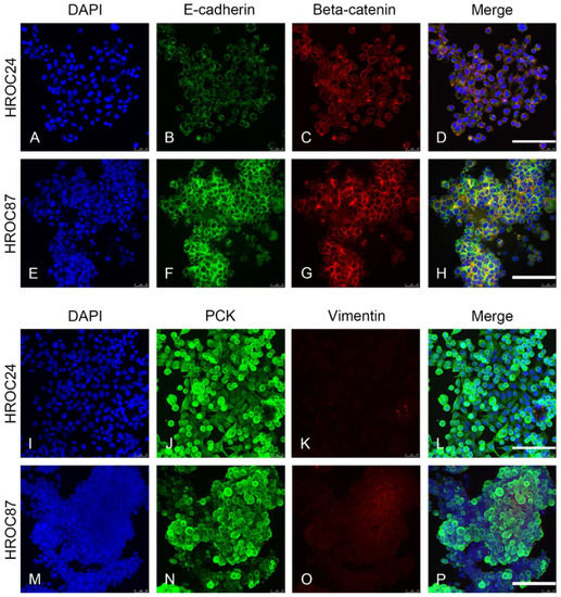 Characterization of 2D-cultured HROC24 and HROC87 cells. Both cell lines express E-cadherin ((B,F), green in (D,H)) and β-catenin ((C,G), red in (D,H)) as well as PCK ((J,N), green in (L,P)), but no vimentin ((K,O), red in (L,P)). E-cadherin and β-catenin clearly co-localize at the cell-to-cell borders in HROC87 tumor cells (yellow in (H)). Cell nuclei were counterstained with DAPI (A,E,I,M). Scale bars in (D,H,L,P): 75 µm for (A–P).