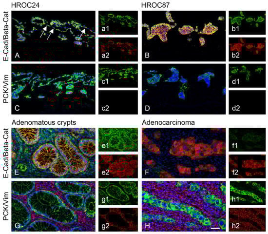 Characterization of the cell lines HROC24 as well as HROC87 cultured on the scaffold SISmuc. While HROC24 cells grow in monolayers and fill the former crypts of the gut (A,C), HROC87 cells grow in dense clusters (B,D). E-cadherin is highly expressed at the cell-to-cell contacts of HROC24 cells (green in (A,a1)) as well as HROC87 cells (green in (B,b1)). β-catenin is more strongly expressed in HROC87 cells (red in (B,b2)) than in HROC24 cells (red in (A,a2)). Both cell lines are positive for PCK (green in (C,D), (c1,d1)) and do not express vimentin (c2,d2). For comparison, adenomatous crypts as well as adenocarcinoma tissue were stained with E-cadherin (green in (E,F), (e1,f1)), β-catenin (red in (E,F), (e2,f2)), PCK (green in (G,H), (g1,h1)) and vimentin (red in (G,H), (g2,h2)). Scale bar in (H): 50 µm for (A–H).