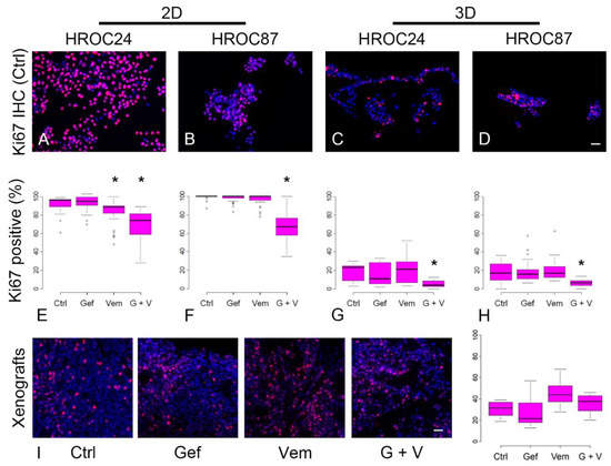 Proliferation of HROC24 and HROC87 cells is influenced differentially by vemurafenib, gefitinib or the combination-therapy. (A–D): Ki67 (red) and DAPI (blue) staining of cells in 2D (A,B) and 3D (C,D) cell culture. In 3D, proliferation is reduced compared to 2D. While under 2D culture conditions, HROC24 cells respond to vemurafenib and to the combination-therapy by reduced proliferation (E), HROC87 cells respond only to the combination-therapy (F). Cultured in 3D, proliferation is in both cell lines only reduced by the combination-therapy (G,H). PDX of HROC87 were stained with Ki67/DAPI and proliferation was evaluated (I). No changes were detected after different treatments in these PDX. *: p < 0.05. Ctrl: untreated control, Gef = gefitinib, Vem = vemurafenib, G + V = combination-therapy with gefitinib and vemurafenib. Scale bars in D and I: 50 µm for A to D and I. ° denotes outliers.