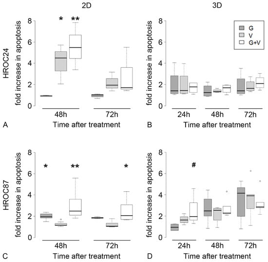 Apoptosis rates in HROC24 versus HROC27 cells in 2D and 3D. We compared apoptosis rates (fold increase to untreated controls) of gefitinib treatment (G), vemurafenib (V) or their combination (G + V). HROC24 cells respond to monotherapy with vemurafenib in 2D as well as to the combination-therapy (A). In contrast, HROC87 cells respond to gefitinib monotherapy in 2D as well as to the combination-therapy (C). In 3D, both drugs are not able to significantly induce apoptosis, neither in monotherapy nor in combination-therapy in HROC24 (B) and in HROC87 cells (D). #: 0.05 < p < 0.1, *: 0.01 < p < 0.05, **: p < 0.01. ° denotes outliers.