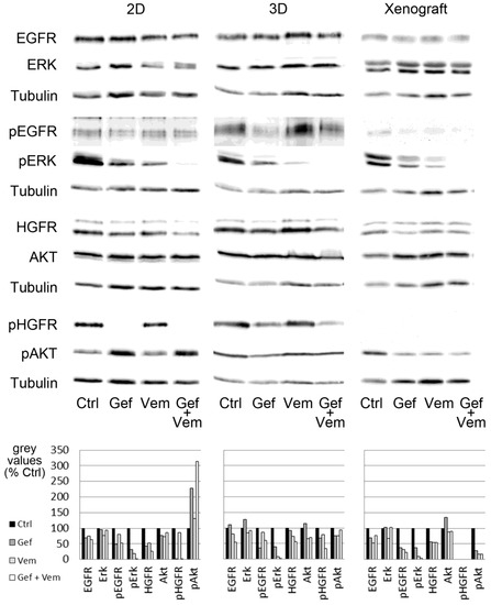 Signaling in HROC87 cells upon treatment with vemurafenib and/or gefitinib. Shown is the Western blot analysis of the phosphorylation status of molecules involved in signal transduction for proliferation (ERK) and apoptosis (AKT) and important receptors in HROC87 cells cultured under 2D and 3D conditions as well as in matching xenografts. In 2D, 3D and PDX, ERK is partly inhibited by gefitinib and vemurafenib in monotherapy, but nearly completely inhibited by the combination-therapy. In contrast to 2D, AKT phosphorylation show no clear upregulation under 3D culture conditions. HGFR could not be activated in the PDX at all. Only in the 2D model, gefitinib and the combination-therapy results in a strong inactivation of the HGFR. Ctrl: untreated control, Gef: gefitinib, Vem: vemurafenib, Gef + Vem: combination-therapy of gefitinib and vemurafenib. Grey values of densitometric analysis of the representative blots are shown in the diagrams (% of Ctrl). Blots with weight markers are shown in Figure A4, Figure A5 and Figure A6. Densitometric analyses of grey values from all 4 to 6 experiments (Figure A7) as well as from the representative blot depicted here (Table A1) are shown in the appendix.