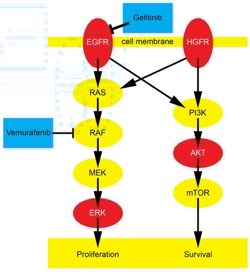 Simplified overview of central pathways involved in proliferation and survival in CRC. EGFR is inhibited by gefitinib, but there is an interference with HGFR. While vemurafenib only blocks the left pathway in case of BRAF mutation, this interplay between the two pathways could be a reason for the low efficacy of vemurafenib in CRC even in case of an existing BRAF mutation.