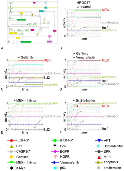 In silico modeling of drug-responses of in 3D cultured HROC87 cells. (A) Part of the topology (the complete network is given in Figure A8 of the appendix). Our in silico topology accommodates well-documented major growth and apoptotic cascades in CRC and mimics as close as possible the experimental treatment responses as well as the behavior regarding untreated growth. Directed arrows in the network topology represent activation while blunted arrows represent inhibition. Rectangles: genes/proteins. (B) Untreated condition. HROC87 cells show a malignant phenotype with a weak activation of apoptosis (olive-green triangle curve) and high proliferation (grey square curve) signal. Visible in the different curves is also the EGFR (EGFR*), the HGFR (HGFR*), ERK, MEK and additional relevant curves such as Casp3/7. (C) Gefitinib treatment. HROC87 cells show only a weak induction of apoptosis (olive-green triangle curve), but no changes in proliferation (grey square curve) upon gefitinib (yellow square curve, activation: 1). (D) Combination treatment (gefitinib plus vemurafenib). HROC87 cells show only a weak induction of apoptosis (olive-green triangle curve) and reduction of proliferation (grey square curve). Treatments: gefitinib (yellow square curve, activation: 1, not seen because hidden by the curve for vemurafenib) and vemurafenib (blue rectangle curve, activation: 1). (E) MEK inhibition. This shows an induction of apoptosis (olive-green triangle curve) and reduction of proliferation (grey square curve) in HROC87 cells. Notably, there is an inactivation of ERK and Bcl2. (F) Bcl2 inhibition. As expected from blocking an anti-apoptotic protein (Bcl2), the simulation suggests an induction of apoptosis (olive-green triangle curve, positive control) but proliferation stays unchanged as there is no connection with MEK-ERK. * = activated form.