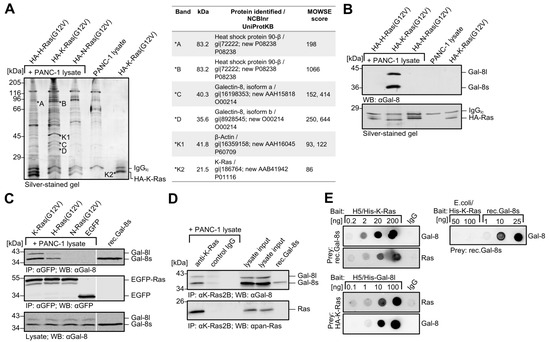 Identification of Galectin-8 as K-Ras interaction partner. (A)Identification of Galectin-8 by mass spectrometry. Purified, post-translationally modified HA-H-Ras (G12V), HA-K-Ras (G12V), and HA-N-Ras (G12V) (500 ng) immobilized on anti-HA µMacs beads were incubated with PANC-1 lysate and precipitates were separated by SDS-PAGE. As controls, PANC-1 lysate were incubated with anti-HA microbeads only [PANC-1 lysate] and HA-K-Ras (G12V) were coupled microbeads only [HA-K-Ras (G12V)]. Peptides from the indicated proteins (*A–*D, and *K1, *K2 as controls, * = extracted protein band), extracted from the silver-stained gel were analyzed by ESI-MS⁄MS mass spectrometry (n = 3). The table shows the identified proteins. (B) Detection of precipitated Galectin-8. HA-Ras interacting proteins were prepared as outlined in (A) and analyzed by western blot. The upper panel shows the detection of Galectin-8 while using anti-Gal-8 antibody and the lower panel the corresponding silver-stained gel of one third of the eluted proteins to control for equal precipitation of Ras isoforms (n = 3). (C) Interaction of EGFP-tagged Ras isoforms with Galectin-8. EGFP-tagged K-Ras (G12V), H-Ras (G12V), or N-Ras (G12V) were transiently expressed in HEK293 cell, immunoprecipitated using anti-GFP µMacs beads and then incubated with PANC-1 lysate for interaction assays. The precipitates were analyzed by western blotting and rec.Gal-8s (30 ng) was applied as a control. Upper panel: detection of co-precipitated Galectin-8; middle panel: precipitated EGFP Ras isoforms; lower panel: endogenous Galectin-8 in 80 µg of the PANC-1 lysates (n = 4). (D) Co-immunoprecipitation of endogenous K-Ras with Galectin-8. Endogenous K-Ras was precipitated from PANC-1 cell lysate (8 mg) while using anti-K-Ras2B antibody [anti-K-Ras] and protein A µMacs beads. Precipitation with rabbit IgG [control IgG] was performed as control. The precipitates were analyzed by western blotting. The amount of Galectin-8 and K-Ras was controlled in 1/150th of the lysate [lysate input], and 10 ng rec.Gal-8s served as a control. Upper panel: Co-precipitated Galectin-8; lower panel: precipitated K-Ras (n = 3). (E) The interaction of purified K-Ras and Galectin-8. The indicated amounts of His-K-Ras (G12V) [H5/His-K-Ras] or H5/His-Gal-8l, each expressed in H5 insect cells (left panel), and indicated amounts of E. coli-derived His-K-Ras [E. coli/His-K-Ras] and E. coli-derived Galectin-8 short [rec.Gal-8s] (right panel) were dotted as baits onto nitrocellulose membranes. Rabbit IgG served as control. The membranes were either incubated with 1 µg of rec.Gal-8s or with 1 µg HA-K-Ras (G12V) from Sf9 insect cells as a prey. Bound (upper blots) or spotted (lower blots) proteins were detected by the indicated antibodies (n = 2).
