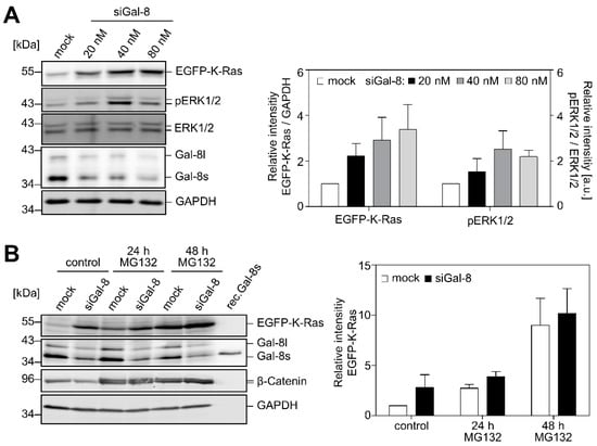 Depletion of Galectin-8 enhances the amount of EGFP-K-Ras and affects ERK. (A) PANC-1/EGFP-K-Ras (G12V)-4.1 cells were transiently transfected with increasing amounts of Gal-8 siRNA [siGal-8] or control siRNA [mock]. Protein expression of ERK1/2, pERK1/2, Galectin-8 and EGFP-K-Ras was determined by western blot. The western blots (left) and the diagram (right) show the increasing amounts of EGFP-K-Ras and pERK1/2 as a function of the concentration of siGal-8. The bar graph shows the mean ± SEM of the densitometric analysis (left: EGFP-K-Ras, right: pERK1/2) as relative intensity normalized to the mock-transfected control (n = 3). (B) Increase of EGFP-K-Ras by MG132. PANC-1/EGFP-K-Ras (G12V)-4.1 cells transfected with siGal-8 or control siRNA were left untreated or additionally treated for 24 h or for 48 h with 5 µM MG132. Lysates were prepared 72 h after transfection and then analyzed by western blot. 30 ng of rec.Gal-8s was applied as a control. Detection of β-catenin served as a control for the activity of MG132. GAPDH served as a loading control. The bar graph shows the mean ± SEM of the densitometric analysis of EGFP-K-Ras normalized to the mock-transfected control without MG132 (n = 3).