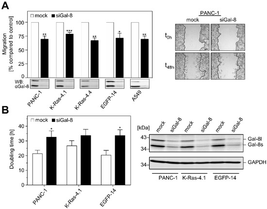 Wound healing and proliferation experiments were performed after the silencing of Galectin-8 expression to elucidate whether Galectin-8 contributes to the development of a malignant phenotype by affecting cell migration or cell proliferation. Figure 4A demonstrates that down-regulation of Galectin-8 significantly inhibited the migration of all PANC-1 cell clones. Normalization of the velocity to the mock transfected control cells (set to 100%) disclosed a migration rate of 79.3 ± 2.73% for siGal-8-treated EGFP-K-Ras-4.1, 67.3 ± 4.68% for EGFP-K-Ras-4.4, 69.88 ± 5.42% for PANC-1 cells, and 72.05 ± 8.26% for EGFP-14. The depletion of Galectin-8 in A549 lung carcinoma cells resulted in a similar reduction with 71.06 ± 5.27% as compared to the control. Thus, an approximately 30% inhibition of cell migration was discovered in pancreatic and lung carcinoma cells. Moreover, Galectin-8 depletion also reduced cell proliferation. The determination of the cell number revealed that the doubling time increased from 26.83 ± 3.34 h to 33.77 ± 4.11 h for EGFP-K-Ras-4.1 cells, 21.49 ± 2.19 h to 32.78 ± 4.05 h for parental PANC-1 cells, and 20.46 ± 3.17 h to 33.76 ± 3.86 h for EGFP-14 cells (Figure 4B, bar graph). Again, Galectin-8 was markedly downregulated, as demonstrated by the western blot in Figure 4B.