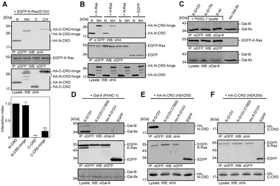 Identification of the interacting domains in K-Ras and Galectin-8. (A) Identification of the Galectin-8 carbohydrate recognition domain (CRD) interacting with K-Ras. HEK293 cells were transiently transfected with plasmids encoding for EGFP-K-Ras (G12V) or HA-tagged N-CRD [N], N-CRD-hinge [NH], C-CRD [C], or C-CRD-hinge [CH]. Equal amounts of EGFP-K-Ras were immunoprecipitated and incubated CRD containing lysate. Precipitated proteins were analyzed by western blot. The upper panel shows co-precipitated HA-CRD proteins and the middle panel the immunoprecipitated EGFP-K-Ras proteins. In the lower panel, one-tenth of the HA-tagged CRD-containing lysates were analyzed as an input control. The amount of precipitated HA-CRD proteins was quantified, related to precipitated EGFP-K-Ras and normalized to the amount of HA-N-CRD. The graph shows the interaction index as mean ± SD (*** p ≤ 0.001, n = 3). (B) Interaction of Ras isoforms the CRDs. EGFP-tagged K-Ras(G12V) [K-Ras], H-Ras(G12V) [H-Ras], N-Ras(G12V) [N-Ras], EGFP, as well as HA-N-CRD [N] and HA-N-CRD-hinge [NH] were expressed in HEK293 cells and interaction studies were performed as described in (A). The upper panel represents the detection of co-precipitated HA-N-CRDs, the middle panel the detection of precipitated EGFP-Ras isoforms, and the lower panel the amount of HA-CRD in one-tenth of the lysates (all n = 3). (C) Interaction of Galectin-8 with active and inactive K-Ras. EGFP-tagged, constitutively active K-Ras (G12V) [K-G12V], dominant negative K-Ras (S17N) [K-S17N], and wild-type K-Ras [K-wt] expressed in HEK293 cells were immunoprecipitated and incubated with PANC-1 lysate as a source of endogenous Galectin-8. The precipitates were analyzed by western blot. The upper panel shows the co-precipitated Galectin-8 as well as 30 ng rec.Gal-8s as control. The middle panel presents the precipitated EGFP-K-Ras proteins. In the lower panel the input of Galectin-8 was analyzed in one-twentieth of the applied PANC-1 lysates (n = 5). (D–F) Interaction of Galectin-8 with farnesylated K-Ras. Fully modified EGFP-K-Ras(G12V) [K-G12V], non-farnesylated EGFP-K-Ras(G12V,C185S) [K-G12V,C185S] and EGFP, expressed in HEK293 cells, and unmodified EGFP-K-Ras(G12V) [rec.K-G12V] expressed in E. coli, was precipitated and incubated with (D) 2 mg of PANC-1 cell lysate, (E) 0.5 mg HA-N-CRD, or (F) 0.5 mg HA-C-CRD containing HEK293 cell lysate. The precipitates were analyzed by western blot. The upper panel of each figure shows co-precipitated (D) Galectin-8, (E) HA-N-CRD, and (F) HA-C-CRD. The middle panels illustrate the amount of precipitated EGFP-tagged K-Ras proteins and the lower panels the amount of Galectin-8 and HA-CRD, respectively, in one-tenth of the lysates used (n ≥ 2).