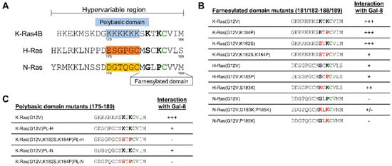 Sequence comparison of the hypervariable region of the Ras isoforms and the generated Ras mutants. (A) Sequence comparison of the hypervariable region of K-Ras, H-Ras, and N-Ras. The farnesylated cysteine is marked in green. (B) Overview of the Ras mutants in which the two lysines of K-Ras (bold) or corresponding amino acids in H-Ras and N-Ras, respectively, were exchanged. Substitutions are shown in red. (C) Overview of the K-Ras mutants in which the polybasic domain was exchanged by the corresponding amino acids of H-Ras or N-Ras. (B,C) The interaction of the Ras proteins with Galectin-8, based on the experiments shown in Figure 6; Figure 7, is summarized, as follows: [+++] = strong interaction, [+] = weak interaction [−] = no interaction.