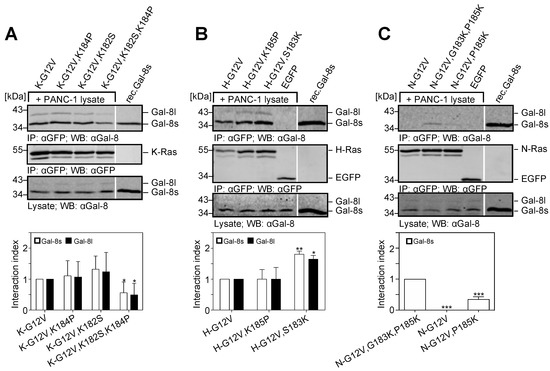Influence of lysine residues of Ras for the interaction with Galectin-8. Ras mutants were expressed in HEK293 cells: (A) K-Ras mutants: [K-G12V], [K-G12V,K184P], [K-G12V,K182S], [K-G12V,K182S,K184P] (B) H-Ras mutants: [H-G12V], [H-G12V,K185P], [H-G12V,S183K] (C) N-Ras mutants: [N-G12V], [N-G12V,P185K], or [N-G12V,G183K,P185K] (see Figure 6 for a detailed description). Co-precipitation assays were performed with PANC-1 cell lysates and precipitates were analyzed by western blot. 30 ng of rec.Gal-8s was used as a control. The upper panels (A–C) show co-precipitated Galectin-8 and the middle panels illustrate immunoprecipitated EGFP-Ras proteins. The lower blots show Galectin-8 in 1/25th of the PANC-1 lysates as an input control. The bar graphs document the amount of precipitated Galectin-8 long (black) and short (white), related to the amount of the precipitated EGFP-Ras mutants, and normalized to K-Ras(G12V) (in A) or H-Ras(G12V) (in B), respectively. The interaction index was calculated with regard to the interaction of Galectin-8 short with N-Ras (G12V,G183,P185K) due to the very low interaction of Galectin-8 with N-Ras(G12V) (in C). Each graph shows the mean ± SD of the interaction index (* p ≤ 0.05; ** p ≤ 0.01; *** p ≤ 0.001, n = 4–5).