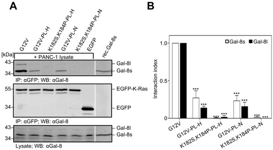 EGFP-K-Ras (G12V) mutants were generated in which the six lysines in the PBD were replaced by the corresponding amino acids of either H-Ras (PL-H) or N-Ras (PL-N) to investigate whether the positively charged PBD (aa 175–180) contributes to the K-Ras-Galectin-8 interaction. Moreover, the lysines in the PBD and the two lysine residues (K182 and K184) in the farnesylated domain were both substituted (see Figure 6C for details). The mutants were expressed as EGFP-fusion proteins in the Galectin-8 negative HEK293 cells, immunoprecipitated, and then incubated with PANC-1 cell lysate to co-precipitate Galectin-8. As exemplified in Figure 8, the substitution of the hexa-lysine stretch in K-Ras caused a significant decrease in the interaction index to 0.27 ± 0.16 for Galectin-8 short and 0.14 ± 0.036 for Galectin-8 long in the case of PL-H, and 0.235 ± 0.12 and 0.16 ± 0.09 in the case the of PL-N when compared to K-Ras (G12V) set to 1.0. When all eight lysine residues in the C-terminus of K-Ras were exchanged, only a faint precipitation of the short isoform of Galectin-8 was evident and the interaction index dropped below 0.02. In summary, the specificity of the interaction of Galectin-8 with K-Ras is indispensably associated with the farnesylation of K-Ras and it is reliant on the existence of multiple lysines within the hypervariable region.