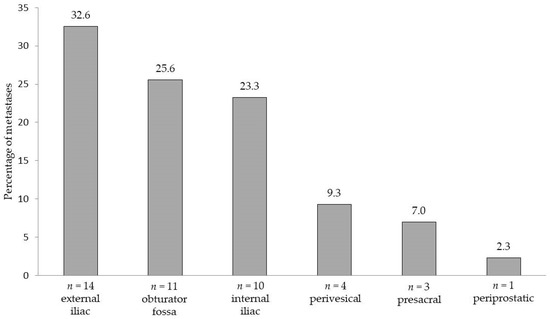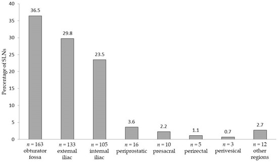 SLNs were also localized outside the established eLND template (e.g., the periprostatic region: 3.6%; presacral region: 2.2%). Figure 1 shows the detailed distributions of all SLNs per anatomical region.