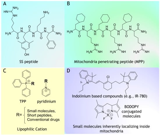 Chemical structure of mitochondria targeting vectors. (A) SS peptide, (B) Mitochondria penetrating peptide (MPP), (C) TPP, pyridinium and Lipophilic Cation and (D) Indolinium based compounds (e.g., IR-780) and Small molecules inherently localizing inside mitochondria.