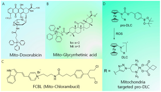 Summary of molecular design of mitochondria-targeted conventional drugs. (A) Mitochondria-targeted doxorubicin, (B) mitochondria-targeted glycyrrhetinic acid, (C) mitochondria-targeted chlorambucil, and (D) mitochondria-targeted pro-DLC.