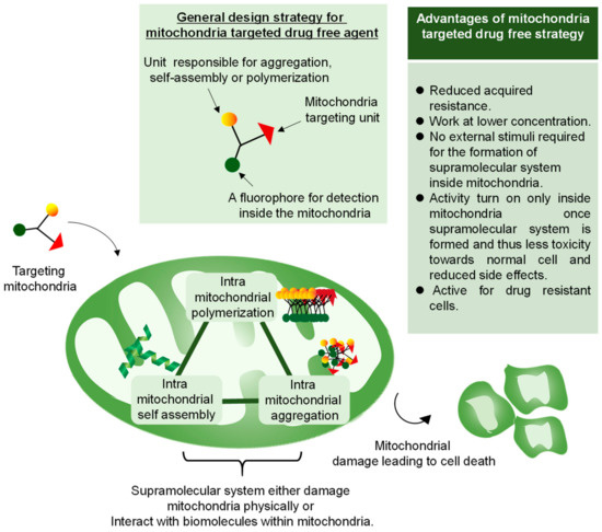 Overview of a mitochondria-targeted drug-free approach. In this approach, the monomer is designed with the ability to either polymerize, self-assemble, or aggregate inside the cancer mitochondria taking advantage of cancer mitochondria characteristics such as higher negative membrane potential, higher basicity inside the matrix or overproduction of ROS. The resulting supramolecular system leads to mitochondria damage, causing cell death.