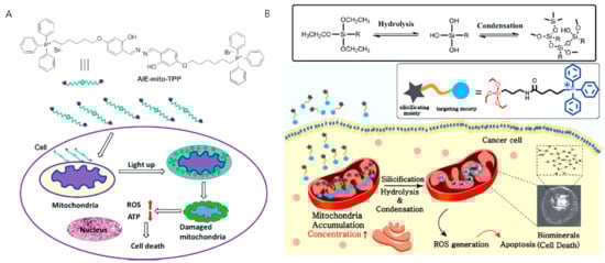 Figure showing (A) intramitochondrial aggregation with a rationally designed probe AIE-mito-TPP, that aggregate inside cancer cell mitochondria driven by higher negative membrane potential and undergoes aggregation-induced emission, later leading to apoptosis and (B) intramitochondrial biomineralization of silane containing compounds that polymerize inside the mitochondria driven by the higher accumulation and slightly basic pH (~8) of the mitochondrial matrix. (Copyright permission received from [69] and we thank RSC for figure 6B from [70]).