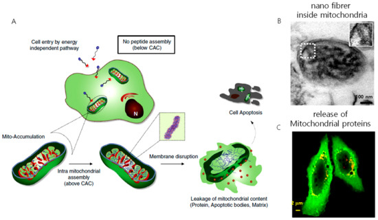 (A) Schematic illustration of mitochondria localization induced self-assembly of peptide amphiphiles. The peptides accumulate inside the mitochondria, exceed the critical aggregation concentration (CAC), and result in the formation of nanofibers. The nanofiber interacts with the mitochondrial membrane, induces the release of proteins, apoptotic factors leading to apoptosis of the cell, (B) TEM image of nanofiber inside the mitochondria, (C) release of proteins from the mitochondria to the cytosol after treating with an intra-mitochondrially self-assembling peptide.(Copyright permission received from [73]).