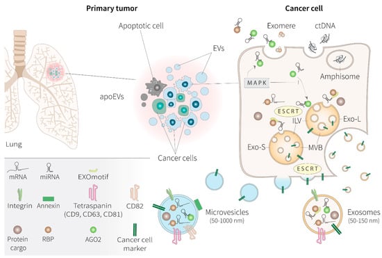 Biogenesis and heterogeneity of tumor-derived extracellular vesicles. A tumor mass is constituted of a heterogeneous population of cancer cells, constantly releasing a variety of extracellular vesicles (EVs), apoptotic bodies (apoEVs), and non-vesicular particles, including exomeres, all involved in the transport of nucleic acids and proteins that can have an active role in promoting tumor survival and aggressiveness. Cargo sorting into EVs involves the endosomal sorting complex required for transport (ESCRT) and partner proteins that include annexins (annexin A1) and tetraspanins (CD9, CD63, CD81, CD82). By reaching their destination exosome cargoes are sorted through the intraluminal vesicles (ILV), which form following the inward of endosomal membrane of the multivesicular bodies (MVBs) and are ultimately secreted upon fusion with the cell surface. Exosomes, similarly to microvesicles, display the same topology of membrane as the cell of origin and can potentially express cancer cell-specific markers. Microvesicles, however, generate from the outward budding of the plasma membrane. Different subsets of exosomes (large and small) with distinct molecular composition have been identified, along with the discovery of a population of abundant non-membranous nanoparticles involved in tumor growth, called exomeres. Exosomes are preferentially enriched with specific populations of miRNA, destined for exportation thanks to the presence of an EXOmotif, recognized by specialized RNA binding proteins (RBPs). During oncogenesis, activation of the mitogen-activated protein kinase (MAPK) pathway suppresses AGO2-mediated sorting of miRNAs to EVs, while favoring AGO2-independent EV loading of miRNAs and non-EV-associated miRNA release. Potentially, microvesicles can accommodate larger RNA species, including transcribing mRNAs. Nucleosomal double strand (dsDNA), although previously reported to be associated with exosomes, might not be directed to the ILVs, and it is instead released through EV-independent mechanisms involving intermediate organelles termed amphisomes. miRNA, microRNA; mRNA, messenger RNA; AGO-2, Argonaute 2; Exo-S, small exosome vesicles; Exo-L, large exosome vesicles.