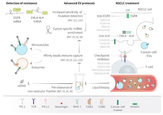In the last ten years, treatment of non-small cell lung cancer (NSCLC) has been revolutionized by the introduction of targeted and immunological therapies in clinical practice [1,2,3]. Currently, the use of tyrosine kinase inhibitors (TKIs) against the epidermal growth factor receptor (EGFR) and the anaplastic lymphoma kinase (ALK) are the first treatment of choice for patients carrying alterations in the EGFR and ALK genes, as well as for patients with alterations in the proto-oncogene tyrosine-protein kinase ROS-1 (ROS1) [4]. On the other side, immune-checkpoint inhibitors represent the first treatment of choice for patients with high expression of the programmed cell death ligand 1 (PD-L1), as monotherapy (pembrolizumab), or in combination with chemotherapy for those patients presenting with no targeted alterations (nivolumab or atezolizumab) [4]. Although both types of treatment prolong progression free survival and improve patient prognosis, resistance mechanisms inevitably arise, leading to disease progression in almost all patients [5]. Currently, molecular profile of NSCLC is assessed by analyzing nucleic acids derived from the primary tumor tissue, but advancements in the ability to detect by longitudinal liquid biopsies the presence of tumor-released particles, including circulating tumor DNA (ctDNA), miRNA, and extracellular vesicles (EVs), has enabled clinicians to better understand the dynamic evolution of this disease [6].