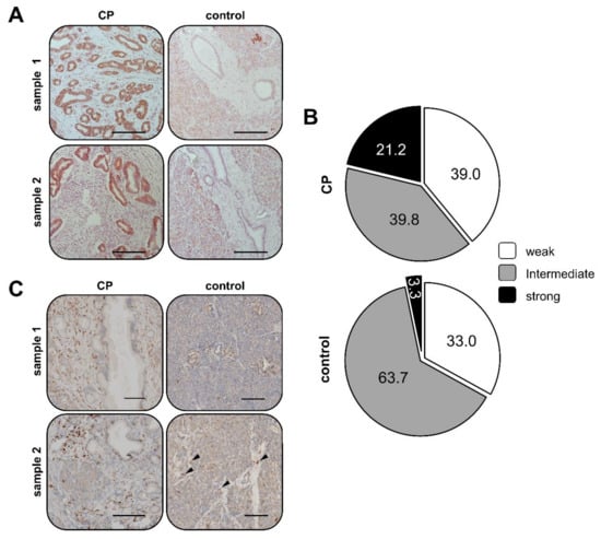 Elevated SDHB expression in pancreatic ducts of CP patients compared to ducts of healthy individuals. Representative images of immunohistochemical stainings of (A+B) succinate dehydrogenase subunit B (SDHB) and (C) CD68 in tissue sections from two CP patients (CP) and two individuals who did not die due to a pancreatic disease (control). Arrow heads indicate CD68+ cells in control samples. Scale bar = 150 µm. (B) Quantification of immunohistochemical analyses of SDHB staining in pancreatic ducts of CP patients (n = 10) and control individuals (n = 22). Pie charts present the proportion of ducts showing weak, intermediate and strong SDHB staining in 523 ducts of CP tissues and 739 ducts of control tissues.
