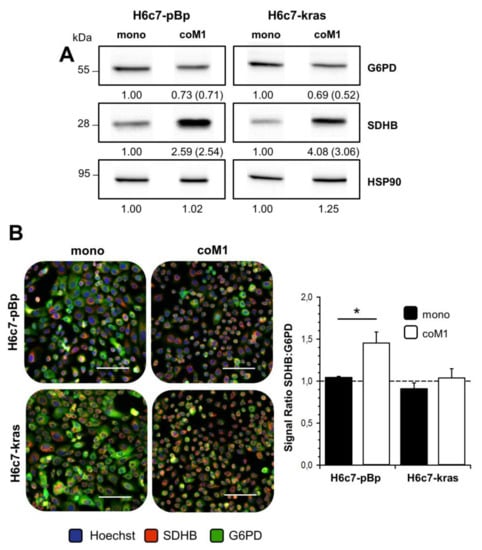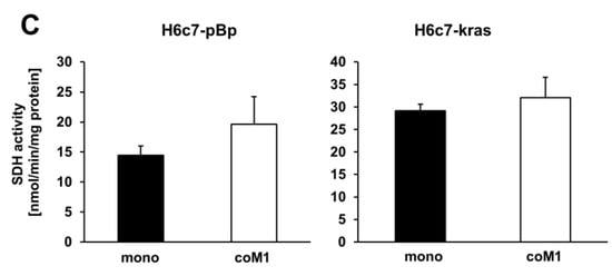 In contrast, the expression of other metabolic enzymes (transketolase, transaldolase, glycerinaldehyde-3-phosphate dehydrogenase, lactate dehydrogenase A/B) and metabolite transporters (monocarboxylate transporter 1/2) in H6c7-pBp and H6c7-kras cells was not affected by co-culture conditions (data not shown). In line with the elevated SDHB expression, both PDEC lines exhibited an elevated SDH activity after co-culture with M1-macrophages, with an effect being more pronounced in H6c7-pBp than in H6c7-kras cells (Figure 2C). Accordingly, elevated SDHB expression and SDH activity seems to be associated with an enhanced oxidative phenotype of the cells (Appendix A, Figure A1). In summary, these data support the view that paracrine interaction with pro-inflammatory macrophages increases the expression of SDHB as well as SDH activity and simultaneously decreases the expression of G6PD in PDECs.