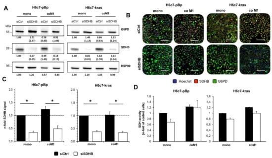 2.3. siRNA Mediated Downregulation of SDHB Expression Diminishes SDH Activity in H6c7-pBp and H6c7-kras cells after Mono- and Co-culture with M1-macrophages