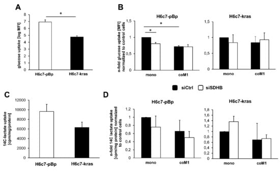 An elevated uptake of glucose might be indicative for an increased metabolic flux into anabolic pathways that foster cell proliferation, while a reduced uptake might indicate a metabolic switch towards utilization of other carbon sources and presumably a less energy consuming state—e.g., quiescence. Thus, it was next investigated whether glucose uptake is impacted by M1-macrophages and if so, whether this is dependent on elevated SDHB expression. As shown in Figure 4A+B 2-NBDG uptake assay revealed that mono-cultured H6c7-kras cells exhibited a significantly lower glucose uptake compared to H6c7-pBp cells (Figure 4A) and that the presence of M1-macrophages led to a reduced glucose uptake in both PDEC lines compared to mono-culture. In line with the more pronounced effects of the co-culture on SDHB expression and SDH activity, glucose uptake was more reduced in H6c7-pBp cells than in H6c7-kras cells (Figure 4B). While under mono-culture, siRNA-mediated knockdown of SDHB also reduced glucose uptake compared to control transfected cells, no further reduction was observed after SDHB knockdown in the PDECs when exposed to M1-macrophages (Figure 4B). Beside glucose, lactate is an important alternative energy source, particularly used by tumor cells []. Hence, lactate uptake in mono- and co-cultured H6c7-pBp and H6c7-kras cells was determined. Similar to the findings for glucose uptake, lactate was also taken up less by mono-cultured H6c7-kras cells compared to H6c7-pBp cells (Figure 4C) and both PDEC lines exhibited a reduced lactate uptake after co-culture with M1-macrophages compared to mono-cultured cells (Figure 4D). Noteworthy, this effect could not be reversed by knockdown of SDHB. Overall, these findings indicate that PDECs exhibit a reduced uptake of glucose and lactate in the presence of M1-macrophages. Since the macrophage mediated effect on glucose and lactate uptake was not influenced by knockdown of SDHB, the observed increase in SDHB expression and SDH activity under these conditions might be rather the consequence than the cause of the altered glucose/lactate uptake in PDECs.