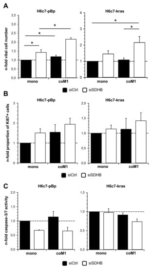 Since an enhanced and uncontrolled proliferative activity is a characteristic property gained during malignant transformation and macrophages have been described to promote epithelial cell proliferation [], it was investigated if M1-macrophages affect cell growth of H6c7-pBp and H6c7-kras cells and whether this relates to the elevated SDHB expression. Vital cell countings revealed slightly increased cell numbers of PDECs co-cultured with M1-macrophages in comparison to mono-cultured cells, with effects being again more pronounced in H6c7-pBp cells than in H6c7-kras cells (Figure 5A). In line with these findings, the proportion of Ki67+ cells was elevated (Figure 5B). Moreover, caspase-3/7 activity indicative for apoptotic cells was slightly increased (Figure 5C) in H6c7-pBp cells and slightly decreased in H6c7-kras cells under co-culture conditions. Importantly, siRNA-mediated silencing of SDHB expression clearly elevated the number of vital as well as the proportion of proliferating cells and reduced caspase-3/7 activity of both PDEC lines under either culture condition. Notably, this effect was more pronounced in PDECs from co-culture with M1-macrophages (Figure 5A+B). Hence, highest vital cell numbers were counted in co-cultured H6c7-pBp and H6c7-kras cells when SDHB expression was silenced (both 2.16-fold). These data suggest that elevated expression of SDHB under co-culture conditions is a counterregulatory mechanism to control excessive cell growth of PDECs in the presence of pro-inflammatory macrophages.