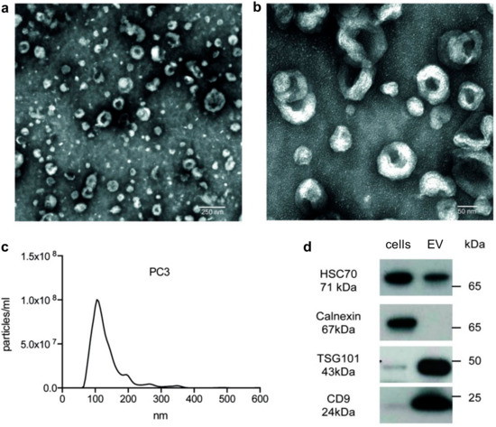Quality control of isolated prostate cancer (PC)3 extracellular vesicles (EVs). (a,b) Transmission electron microscopy (TEM) confirmed the presence of EVs in the isolates from PC3 supernatant. (c) Using nanoparticle tracking analysis (NTA), a typical size distribution of isolated EVs could be seen. (d) Western blotting showed a typical marker constellation on PC3 EVs (HSC70+, CD9+, TSG101+, Calnexin−).