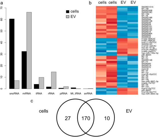 On this basis, our analyses revealed a distinct RNA composition of PC3 cells and EVs. Especially, miRNA, rRNA, and tRNA were enriched in EVs, whereas other studies showed differing results regarding the RNA composition of EVs. Especially, the amount of rRNA varies substantially. In some reports, rRNA is by far the biggest RNA class [25,55], while in other studies, rRNAs constitute only several percent of the RNA content [56]. This might either be because of biological reasons like different starting materials (cell culture supernatant, biofluids) or tissue specificity, or because of technical aspects of cell culture, EV isolation, or NGS. The low amount of mapped rRNA sequences in our study is most likely a result of our RNA extraction protocol, omitting fragments larger than 200 nt. Furthermore, our stringent mapping protocol excluded all reads not covering at least 50% of the sequence to which they mapped. For this reason, the results focus on short ncRNA classes. Among these, snoRNA were found to be predominant in cells. Because smaller EVs in particular, like exosomes, originate from early endosomes and are subsequently loaded with components mainly from the cellular cytoplasm, an underrepresentation of nuclear or mitochondrial RNAs agrees with their biogenesis and can be seen as an indicator of sample quality.