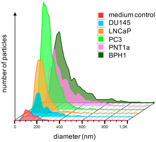 Exemplary single Nanoparticle tracking analysis (NTA) of EVs from all five cell lines and medium control showed a typical size distribution. Owing to varying sample dilutions, necessary to achieve optimal measuring conditions, particle counts are not directly comparable in this graph. Quantitative data are given in Table 5. BPH, benign prostatic hyperplasia.