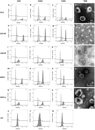 EVs from PC3 and all four validation cell lines showed positive signals for CD9, CD63, and CD81 and typical cup shaped vesicles in TEM (PC3: a–d; DU145: e–h; LNCaP: i–l; BPH1: m–p; PNT1a: q–t). u–w: Particles isolated from medium controls showed no detectable signals for CD9, CD63, and CD81. In TEM, no cup-shaped particles were detectable (flow cytometry analyses: light grey: unstained control; dark grey: stained).