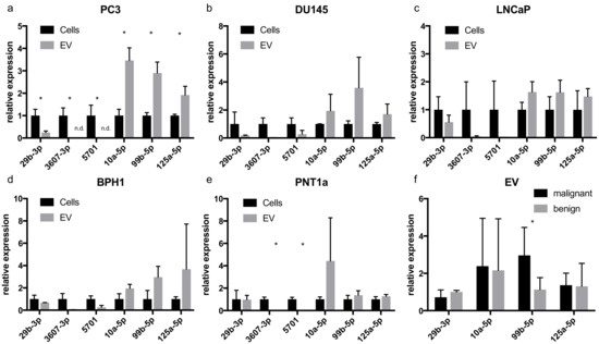 (a–e) miRNA expression in cells and EVs of prostate cell lines measured by qRT-PCR (n = 3 biological replicates per cell line). Tumor cell lines (PC3, DU145, and LNCaP) showed a similar expression of miR-10a-5p, miR-99b-5p, and miR-125a-5p. (f) When comparing expression in EVs of malignant and benign cell lines only for miR-99b-3p, a significant difference was seen. All cell lines showed a comparably low expression of miR-3607-3p and miR-5701, hence a comparison of these two miRNAs between malignant and benign EVs was not possible. The data are shown as relative expression according to the 2−ΔΔCT-method. Data are given as means with SD (* p < 0.05).