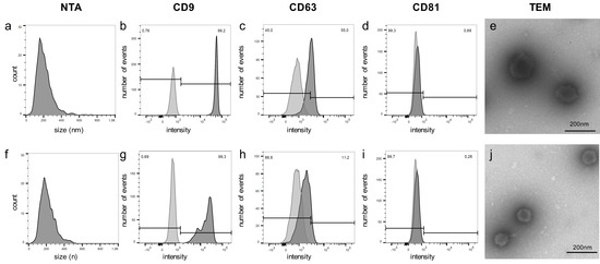 NTA, flow cytometry data, and TEM of EVs of a patient with PCa (a–e) and a BPH control patient (f–j).