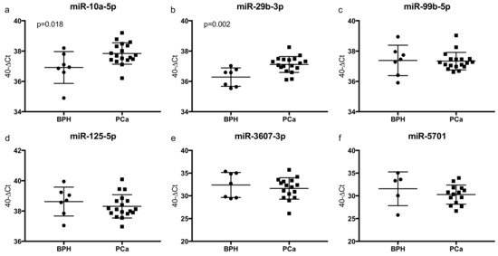 (a–f) qRT-PCR miRNA expression data of plasma EVs of patients with PCa (n = 18) and BPH (n = 7) using the 40-ΔCt-method, in which an increment of 1 in the y-axis equals a doubled expression. Higher values correspond to a higher expression and each dot reflects a single patient. The results are given as mean with SD. miR-5701 expression could only be determined in five BPH patients.