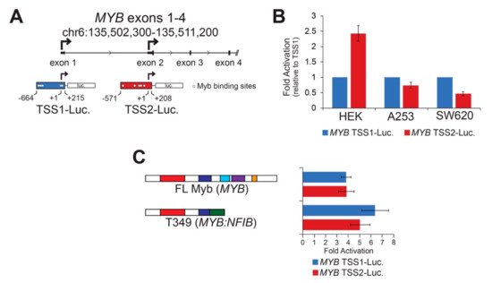 MYB TSS2 has been described previously [18,19], but little is known about its regulation, function, or significance in human tumors. We utilized reporter assays to perform basic characterizations of both MYB promoters. MYB TSS1 and TSS2 were cloned upstream of the luciferase reporter gene (Figure 2A and Figure S2), then introduced into different cell lines where their basal activities were measured (Figure 2B). Both TSS1 and TSS2 functioned as bona fide promoters in these assays, but they displayed cell type-specific differences (Figure 2B). The two promoters displayed similar activities in A253 salivary gland epidermoid carcinoma cells, but TSS2 was more active than TSS1 in HEK293 human embryonic kidney cells, and the opposite was true in SW620 colorectal adenocarcinoma cells. These data confirm that the region upstream of exon 2 can act as a promoter in human cells and suggest that MYB promoter selection is regulated in a cell-type specific manner.