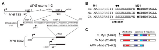 - Rushton, J.J.; Davis, L.M.; Lei, W.; Mo, X.; Leutz, A.; Ness, S.A. Distinct changes in gene expression induced by A-Myb, B-Myb and c-Myb proteins. Oncogene 2003, 22, 308–313. [Google Scholar] [CrossRef]