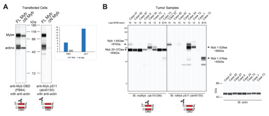 Cell pellets were lysed in RIPA Lysis and Extraction Buffer (ThermoFisher, #89900) with protease inhibitor for 10 min on ice followed by sonication (Bioruptor, high, 30 s on/30 s off, 5–10 min, Diagenode Inc., 400 Morris Avenue, Suite 101, Denville, NJ 07834, USA). Capillary Western blotting was performed using the WES automated system (ProteinSimple, 3001 Orchard Parkway, San Jose, CA 95134 USA), all results were verified via traditional blotting methods. Cell lysates were diluted with a sample of 0.1× Sample Buffer (ProteinSimple) to a concentration of ~0.6 ug/uL. Protein separation and quantification was performed using the 12–230 kDa ladder, according to the manufacturer’s instructions. Antibodies used were as follows: rabbit anti-Myb (Rabbit antisera PB84, directed against amino acids 72–192 of Myb protein, 1:100, [30]), rabbit anti-Myb pS11 (ab45150; 1:200, Abcam, 1 Kendall Square, Suite B2304 Cambridge, MA 02139-1517, USA), and anti-βactin (1:100). Ready to use mouse (042-05) and rabbit (042-206) HRP-conjugated secondary antibodies were purchased from ProteinSimple. Myb antibodies were validated using Myb protein expressed from plasmid cDNA (positive control) and paired untransfected HEK293TN cell lysate (negative control), which does not express Myb.