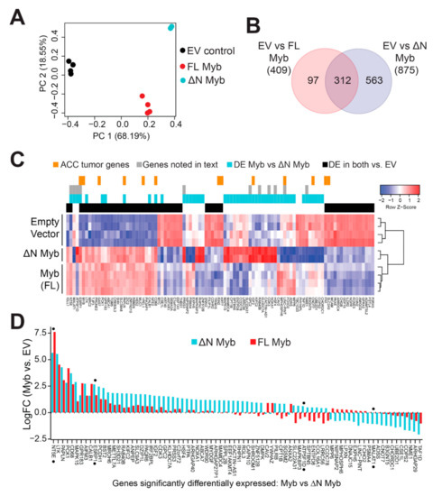 Minor changes in the Myb protein have been previously shown to have dramatic effects on its transcriptional activity and its ability to activate specific target genes [34,35,36,37]. We hypothesized that N-terminal truncation may alter the activity of Myb in ACC tumor cells. We used lentivirus vectors to express either full-length Myb or ∆N Myb and then used RNA-seq to measure subsequent changes in gene expression. We used SW620 colorectal adenocarcinoma cells, which express very low endogenous Myb expression, since both TSS1 and TSS2 were functional in those cells in our transfection assays (Figure 2B). We achieved up to ~95% transduction with moderate overexpression of Myb proteins, judged by western blot analysis (Figure S5). Principal component analysis (PCA) showed clear separation of the three treatments (Figure 5A). Full-length Myb (red) and ∆N Myb (cyan) were separated from empty vector control (EV, black) along the first component (PC1, horizontal axis), which explained almost 70% of the variation in the data. Even these initial analyses distinguished full-length Myb (red) from ∆N Myb (cyan) along the second component (PC2, vertical axis), which accounted for 18% of the variation (Figure 5A). The PCA plot highlighted an exciting difference in the gene expression signatures elicited by the two Myb protein isoforms, which differed only by 20 amino acids at their N-terminus.