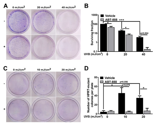 Poly (ADP-ribose) polymerase (PARP) inhibition decreases clone formation and ultraviolet B (UVB)-induced mutation rate. (A,B) Colony formation assay of HaCaT cells after 10 days post-UVB exposure was assessed by clonogenic assay (n = 4). (C,D) HPRT mutation assay was carried out on CHO cells. Preselected hypoxanthine-guanine phosphoribosyltransferase (HPRT) mutant cells were cultured for 10 days post-UVB (n = 3). −/+ represent vehicle (−) or ABT-888 (+) treatment * and *** indicate statistically significant difference at p < 0.05 and p < 0.001, respectively. Error bars represent SEM.