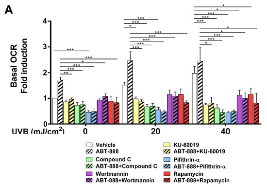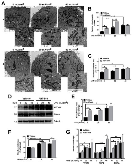 Mitochondrial biogenesis, by promoting the growth, formation, and assembly of newly synthesized mitochondria, has recently been linked to cancer development [61], apoptosis [62,63,64], and DNA damage [18,28,65]. Accumulating evidence suggest that DNA damage can initiate mitochondrial biogenesis which is accompanied by elevation in mitochondrial number, area, and mass [18,28,65,66]. Transmission electron microscopic images revealed that UVB-treated cells contain more and longer cristae than non-irradiated cells (Figure 3A). This morphological alteration became more pronounced after PARP inhibition. Similarly, UVB treatment increased both mitochondria number and total mitochondrial area (Figure 3B,C). ABT-888 treatment resulted in further increase in these parameters suggesting that PARP inhibition may boost UVB-mediated mitochondrial response. Since mitochondrial content changes with the balance between mitochondrial biogenesis and turnover, we quantified mitochondrially encoded cytochrome C oxidase I (MTCO1)/succinate dehydrogenase complex, subunit A (SDHA) ratio that is a marker of mitochondrial biogenesis. This experiment demonstrated that the mitochondrially-encoded MTCO1 show strong induction after UVB irradiation and become even more expressed after PARPi, while the expression of the nuclearly-encoded SDHA protein is unaltered (Figure 3D,E). The higher mitochondrial mass after both UVB and PARPi (Figure 3F) and the enhanced expression of the master regulators of mitochondrial biogenesis including mitochondrial transcription factor A (TFAM), nuclear respiratory factor 2 (NRF2), and estrogen-related receptor alpha (ERRA) (Figure 3G) also suggest that PARPi augments the UVB-triggered mitochondrial biogenesis.