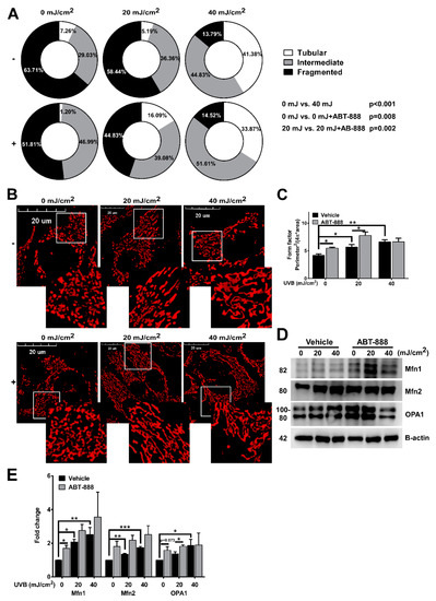 To identify if UVB and PARPi also alters mitochondrial dynamics, we evaluated mitochondrial morphology using confocal microscopy. Non-irradiated cells mainly contained fragmented mitochondria which normally represents low metabolic activity. After 40 mJ/cm2 UVB, a statistically significant reduction in the frequency of fragmented mitochondria and an elevation in tubular mitochondria was detected compared to the non-irradiated control. The frequency of intermediate mitochondria was increased after PARPi at 0 mJ UVB compared to the vehicle control, and we also observed decreased fragmented mitochondrial frequency and higher percentage of tubular mitochondria after 20 mJ/cm2 + ABT-888 treatment compared to the 20 mJ/cm2 UVB exposed cells (Figure 4A). The dose-dependent effect of UVB in the branching aspect of mitochondria (Figure 4C) as defined by form factor ((Perimeter2/(4π × area)) was also observed suggesting enhanced mitochondrial fusion after UVB and PARP inhibition. Finally, to confirm that the observed mitochondrial fusion are regulated by the dynamin-related proteins, we checked the expression of mitofusin-1 (Mfn1), mitofusin-2 (Mfn2), and optic atrophy 1 (OPA1) (Figure 4D,E). Similarly to mitochondrial morphological alterations, we detected enhanced protein expression of Mfn1, Mfn2, and OPA1 which support mitochondrial fusion at the outer and inner mitochondrial membrane. These results clearly indicate that besides enhancing mitochondrial biogenesis, UVB also triggers mitochondrial fusion and increases the complexity of mitochondrial network which is more prominent after PARP inhibition.