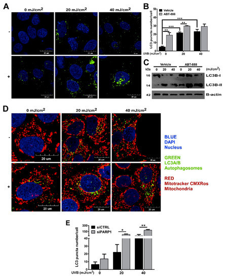 Poly (ADP-ribose) polymerase (PARP) inhibition and ultraviolet B (UVB) induces bulk autophagy but not mitophagy. (A) Expression of microtubule-associated proteins 1A/1B light chain 3B (LC3A/B) protein marker of autophagy by confocal microcopy (n = 3). Scale bar is presented on the figure. (B) Quantification of LC3A/B puncta in cells derived from confocal images in Figure 5A (n = 3). (C) LC3A/B proteins were quantified by Western blotting. Brightness and contrast were adjusted. Protein of interest were normalized to the loading control B-actin. (D) Dual staining of LC3-puncta and mitochondria by confocal microscopy (n = 3). (E) Quantification of LC3A/B puncta in PARP1 siRNA and control siRNA-transfected cells derived from confocal images (n = 4) −/+ represent vehicle (−) or ABT-888 (+) treatment *; ** and *** indicate statistically significant difference at p < 0.05 and p < 0.01, p < 0.001, respectively. Error bars represent SEM.