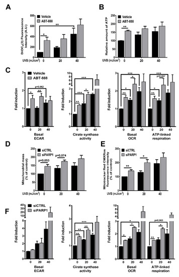 Alterations in the mitochondrial network is strictly controlled by intra- or extracellular signals connecting mitochondrial biogenesis and fusion with energy perturbations. To test whether increased mitochondrial biogenesis and fusion after UVB and PARP inhibition supports mitochondrial activity, we evaluated mitochondrial parameters. Our results show that UVB exposure increased mitochondrial membrane potential (Figure 6A) and total ATP level (Figure 6B). PARPi boosted the UVB-induced mitochondrial membrane hyperpolarization and it also raised ATP level compared to UVB-irradiated samples. Mitochondrial membrane potential and ATP levels change independently, and hyperpolarization of mitochondrial membrane potential does not necessarily correlate with ATP production but it may stem from decreased F0F1 ATP synthase activity and concomitant lower ATP production. Furthermore, increased ATP level may result either from enhanced glycolysis, increased respiration via electron flow from complex I-V, or decreased energy expenditure. In order to clarify the reasons of the elevation in ATP levels, we complemented our data with quantitative analysis of metabolic flux by XF96 oximeter and monitored extracellular acidification rate (ECAR) indicating glycolysis and oxygen consumption (OCR) representing oxidative phosphorylation with sequential addition of oligomycin and antimycin. Although basal ECAR (Figure 6C) is statistically unchanged after UVB exposure, PARP inhibition enhanced the rate of glycolysis after 20 mJ/cm2 UVB dose and at non-irradiated conditions. In contrast, UVB dose-dependently increased oxygen consumption and ABT-888 treatment significantly augmented OXPHOS compared to 0 or 20 mJ/cm2 UVB (Figure 6C). Citrate synthase (CS) activity, the initial enzyme in the tricarboxylic acid (TCA) cycle catalyzing the formation of citrate from oxalacetate and acetyl-CoA, showed significant elevation after UVB radiation, which was augmented by PARP inhibition (Figure 6C). This suggest that not only the distal part of respiratory chain is altered by UVB and PARPi, but also increased terminal oxidation is preceded by elevation in TCA activity as well. To exclude the possibility of the off-target effects of ABT-888, we confirmed the mitochondrial changes by PARP1 silencing. We detected increased mitochondrial mass reflecting mitochondrial biogenesis after UVB in control siRNA-transfected keratinocytes that was elevated by PARP1 knockdown (Figure 6D). Mitotracker Red CMXRos incorporation into mitochondria reflecting mitochondrial membrane potential also showed similar changes similarly after vehicle and ABT-888 treatment (Figure 6E). Although, we could not detect difference in basal ECAR between the control and PARP siRNA-transfected cells, CS activity and OXPHOS showed significant changes (Figure 6F) confirming the pivotal role of PARP1 in the UVB-induced mitochondrial changes. In summary, we can conclude that elevation in cellular ATP level after UVB is due to enhanced energy production and cells increase their energy reserves through both glycolysis, TCA cycle, and OXPHOS after PARP inhibition.
