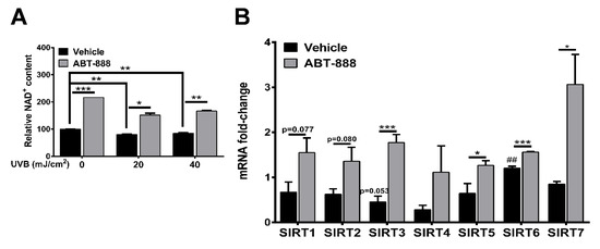 NAD+ and NADH plays a central role in redox homeostasis and cellular metabolism including glycolysis via glyceraldehyde-3-phosphate dehydrogenase (GAPDH) activity [78] and OXPHOS by regulating the transfer of electrons to complex I [79]. UVB irradiation caused a slight but significant decrease in NAD+ level after both 20 and 40 mJ/cm2 UVB (Figure 7A). ABT-888 treatment efficiently restored intracellular NAD+ content suggesting the role of PARP1 in UVB-mediated NAD+ depletion. It has been known that a decrease in NAD+ by enhanced PARP activation inhibits another NAD+-consuming enzyme family, the class III histone deacetylase Sirtuins [33,34,36,37,38,80] which regulate diverse cellular processes [81] including mitochondrial metabolism and have intricate relationships with PARPs [82,83]. To test whether UVB modulate Sirtuin expression and PARPi can restore their expression after UVB similarly as NAD+ level changes, we chose the 40 mJ/cm2 UVB dose which caused a more significant increase in NAD+ level after ABT-888 treatment compared to UVB-irradiated cells. We detected slight mRNA downregulation in SIRT1, SIRT2, SIRT3, SIRT4, SIRT5, and SIRT7 after 40 mJ/cm2 UVB dose (Figure 7B) and PARP inhibition increased the gene expression of all Sirtuins suggesting that intracellular NAD+ availability after UVB and PARPi may regulate SIRTs expression. Although, the role of Sirtuins in the UVB-mediated cellular response and skin physiology is poorly characterized [84,85,86,87,88], here we revealed the Sirtuin expression-modulatory effect of NAD+ after UVB and PARP inhibition. To explore the potential role of NAD+ and Sirtuins in supporting glycolysis or oxidative phosphorylation further experiments are needed.