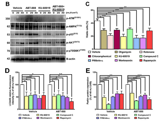 2.8. PARP Inhibition and UVB-Induced Oxidative Phosphorylation and Autophagy Are Dependent on ATM, AMPK, p53, AKT, and mTOR Activation