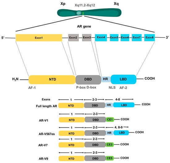 Genomic organization of the AR gene and frequently reported androgen receptor (AR) splice variants. The gene encoding for androgen receptor is localized on the long arm of chromosome X in the region Xq11.2-q12. It is comprised of 8 exons that code for the mature androgen receptor protein having three functional domains: N-terminal binding domain (NTD), DNA binding domain (DBD), and a carboxy-terminal ligand binding domain (LBD) that is separated from DBD by a short hinge region (HR). Exon1 encodes for the NTD, exon 2–3 encode for the DBD, exon 4–8 encode for the hinge region and LBD. Several AR splice variants have been reported that show truncation at DBD or LBD. AR-V1 is truncated at the end of exon 3 and contains 19 amino acids from cryptic exon 1 (CE1). AR-V567 is created by skipping of exons 5–7 in the AR mRNA, while AR-V7 has splicing of cryptic exon 3 (CE3) after exons 1–3, and AR-V9 is generated by splicing of cryptic exon 5 (CE5) after exon 3. AR-V1, AR-V7, and AR-V9 all lack LBD.